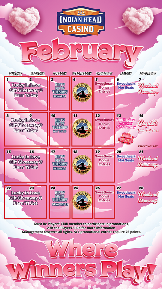 NIFTY FIFTY TUESDAYS Up to $35 Bonus Slot Play! The more you play, the more we pay! MUST BE 50 YEARS OR BETTER FOR ALL NIFTY FIFTY PROMOS. SALUTE TO SERVICE WEDNESDAYS Swipe at Kiosk for rewards every Wednesday. Military and Veterans ONLY. Proof of service required for ALL Salute to Service promos.